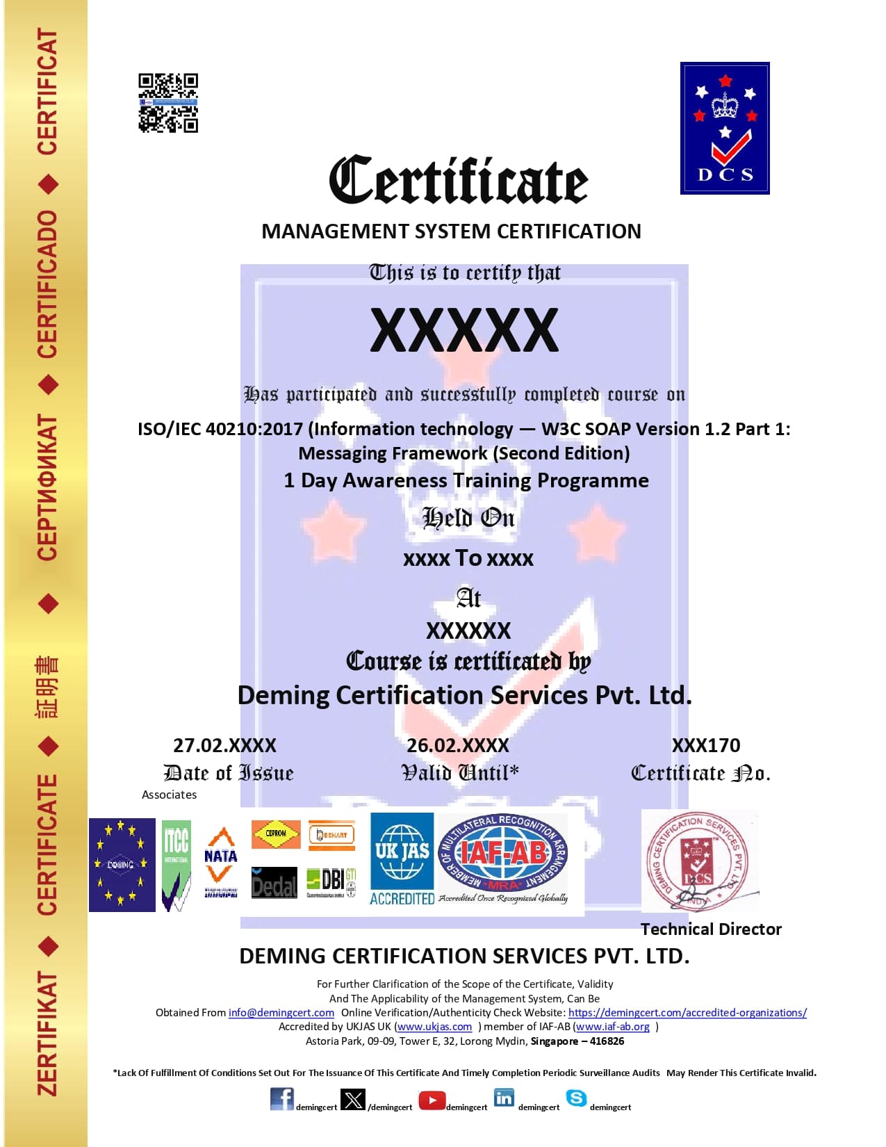 ISOIEC 40210 INFORMATION TECHNOLOGY 1 DAY AWARENESS TRAINING Is Rs 5500 +18%GST Payment should be made by Cheque / DD in favor of “Deming Certification Services Pvt Ltd, Mumbai”